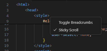 sticky scroll이 적용된 부분에 마우스 우클릭을 한 후, Sticky Scroll의 체크를 풀면 바로 돌아온다.