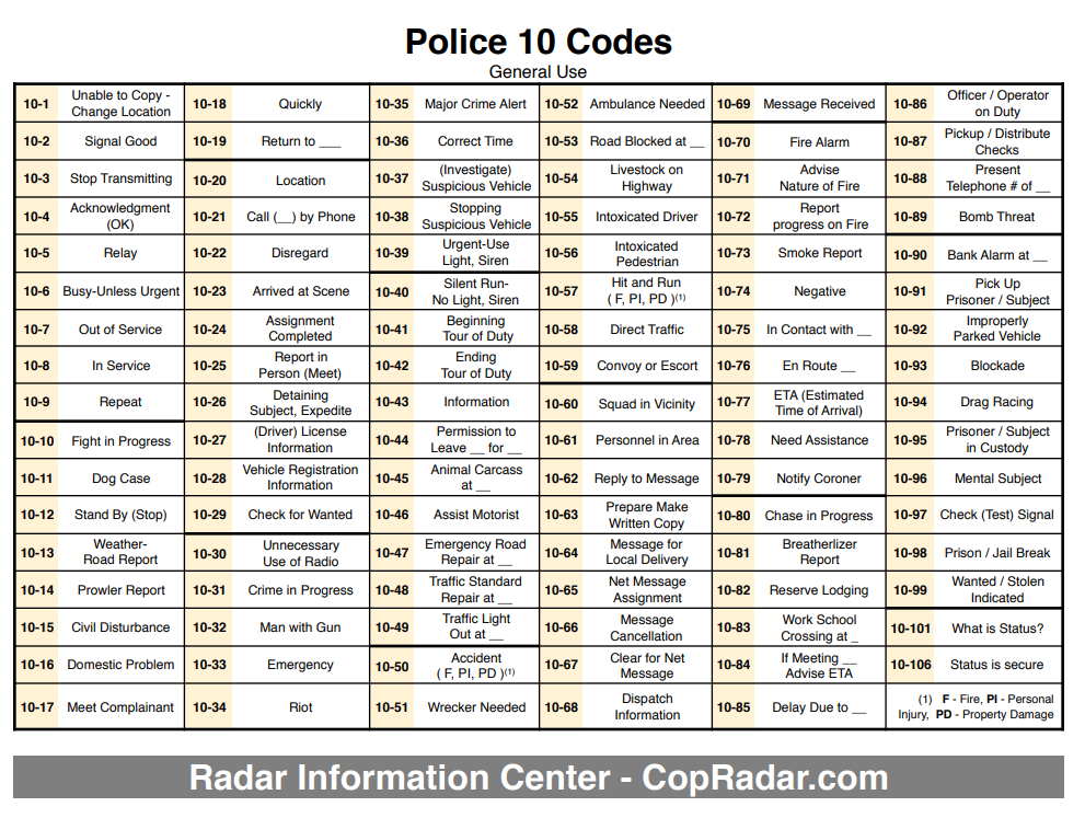 코드는 완전한 문장보다 빠르게 정보를 전달한다. 예를 들어 "10-33"은 "긴급, 모든 유닛 대기"보다 빠르다.
