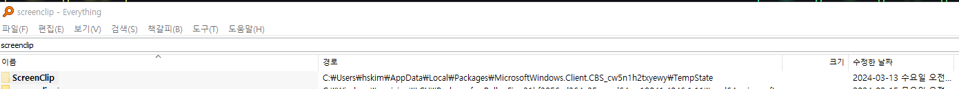 everything을 열고, 검색창에 'screenclip'을 검색하면 이렇게 상단에 한 폴더가 보인다. 만약 같은 이름의 폴더가 여러개라면