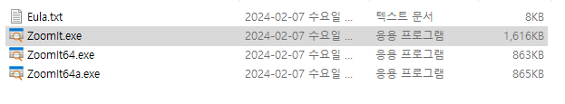 zip파일에는 4가지 파일이 존재하는데, Eula는 이 프로그램의 라이선스를 표시한 텍스트 파일이며, 실행하면 되는 프로그램은 ZoomIt.exe 혹은 ZoomIt64.exe 를 눌러 실행한다.