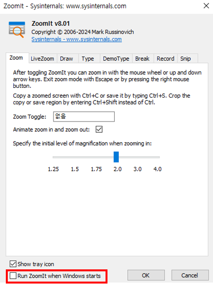 하단에 이 박스를 체크하면 윈도우가 시작할 때 자동으로 ZoomIt을 실행한다.