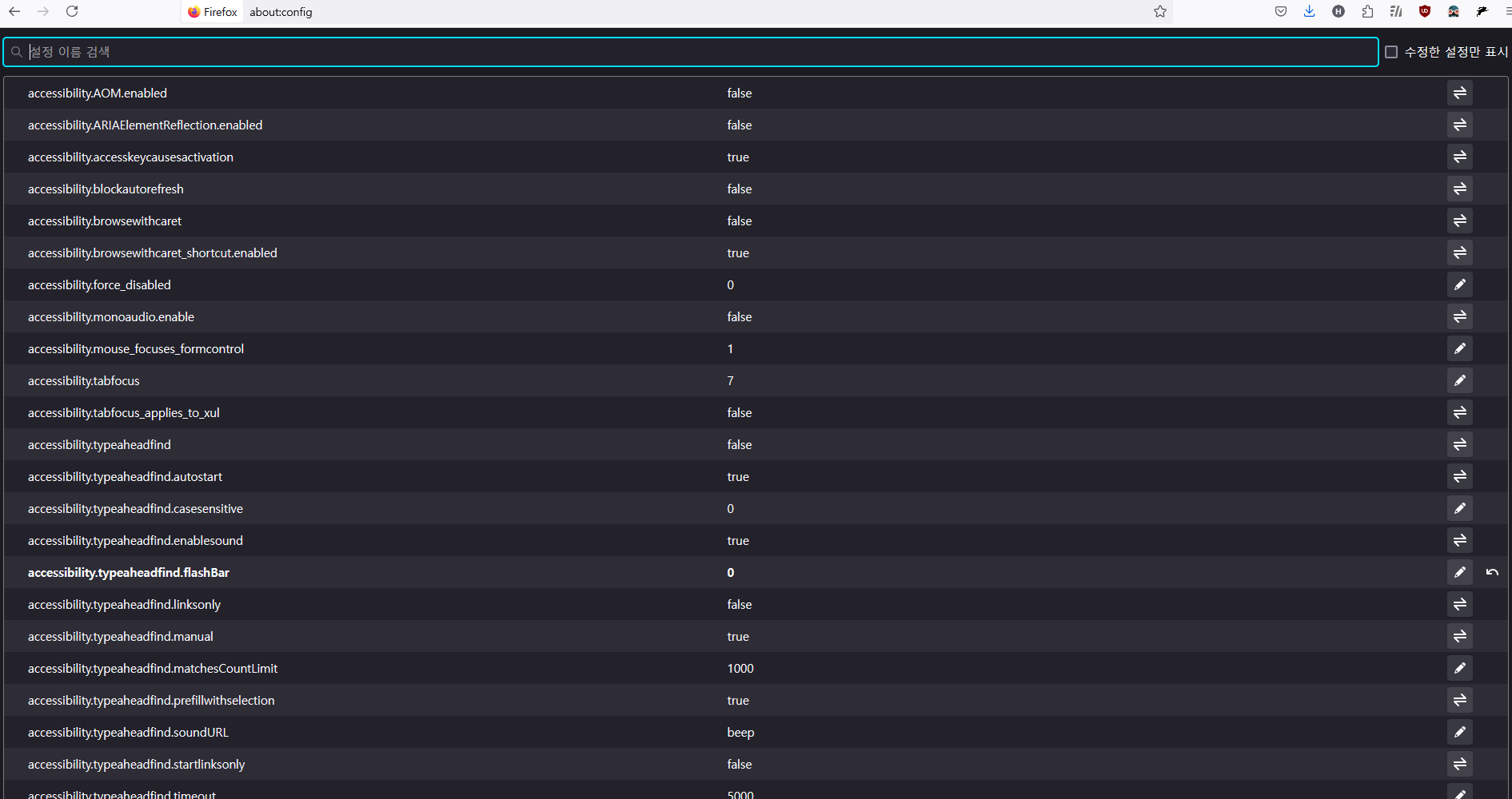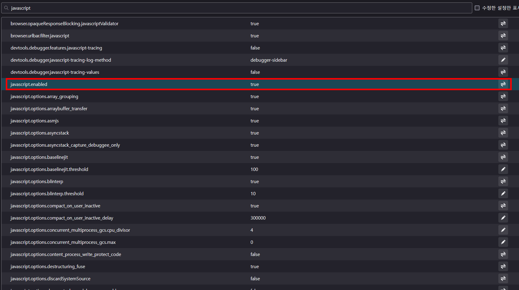 그럼 여기서 javascript.enabled가 있는데, 여기서 이것을 더블클릭하면 true 가 false로 변경되며 의도한대로 javascript를 비활성화할 수 있다.