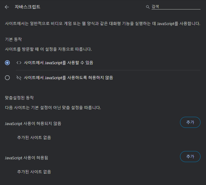 Chrome의 경우엔 chrome://settings/content/javascript 에서 단순히 버튼만 누르면 변경할 수 있었는데 Firefox에서는 그런 것이 없었다.