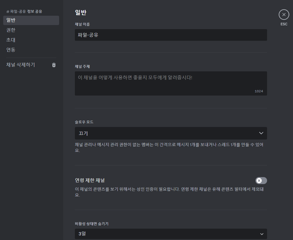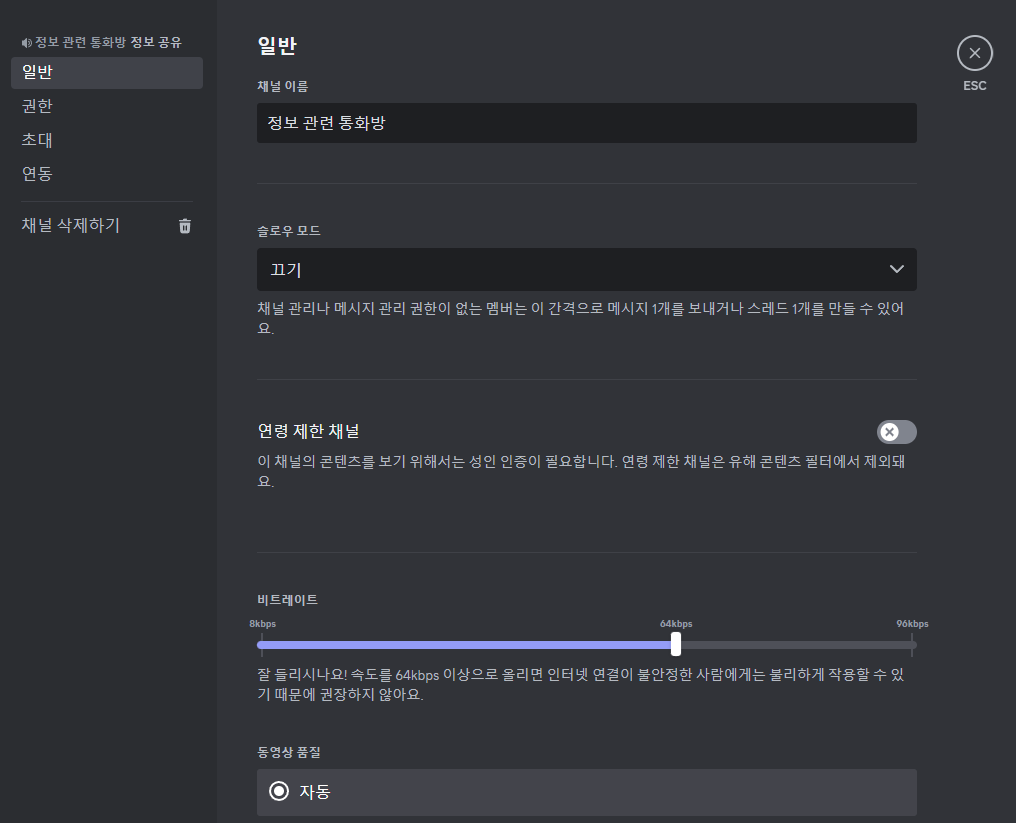 음성 채널의 경우 '일반' 설정에서는 다음과 같은 내용들을 설정한다.