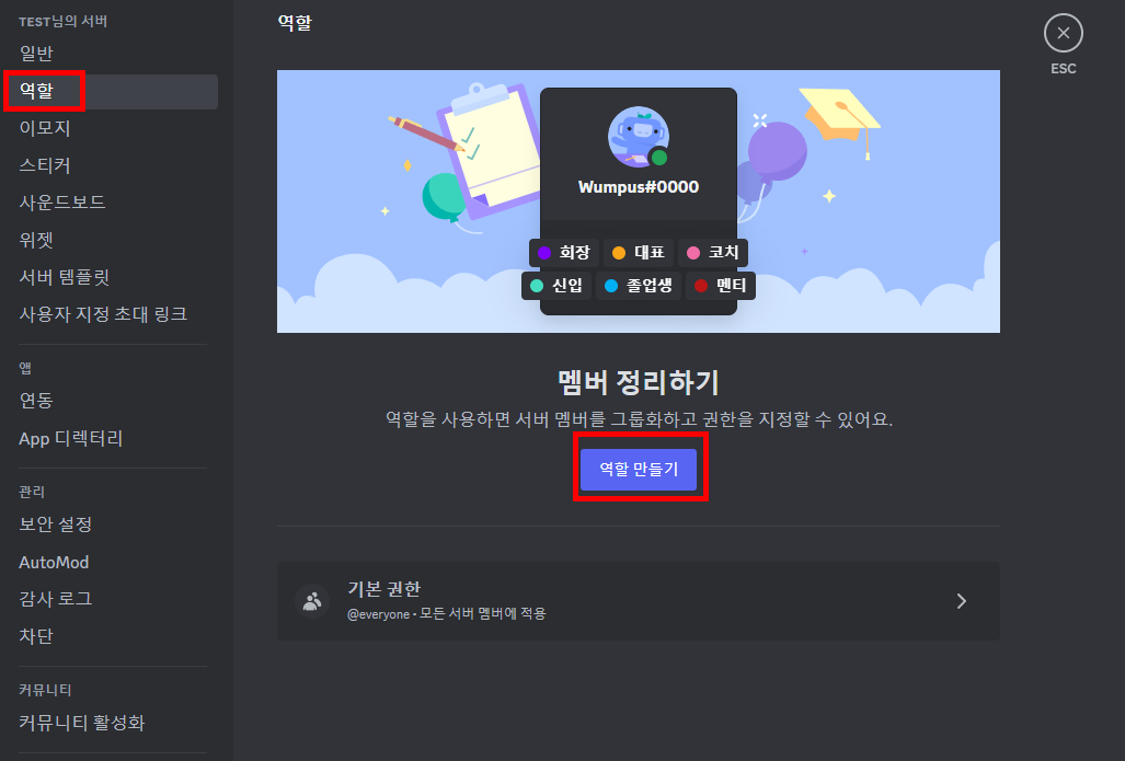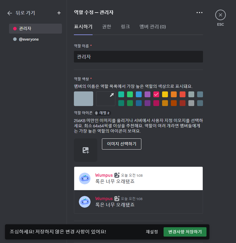 관리자 권한의 경우 '권한' 탭에서 '관리자'를 키면 해당 역할은 관리자 역할이 된다.