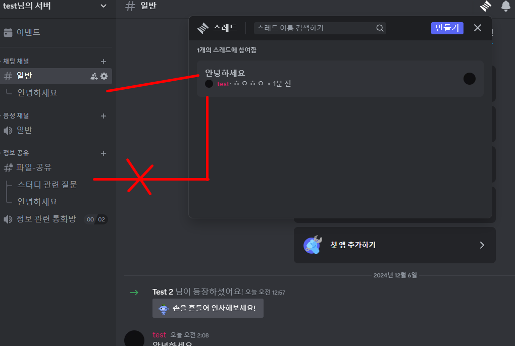 위 예시에서는 일반 채널에서 '안녕하세요'스레드를 만들었을 때 스레드를 탐색하는 공간에서 '파일-공유'채널의 스레드를 찾지 못하는 것을 알 수 있다.