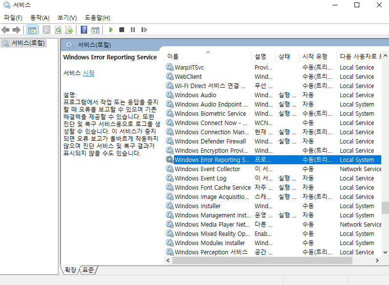 아래로 스크롤을 하면 'Windows Error Reporting Service'를 찾을 수 있다.
