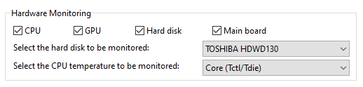 'Select the hard disk to be monitored'는 저장공간을 모니터링할 때 어떤 것을 기준으로 모니터링할 것인지 설정하는 것이며, 그 아래 CPU temperature도 마찬가지이다.